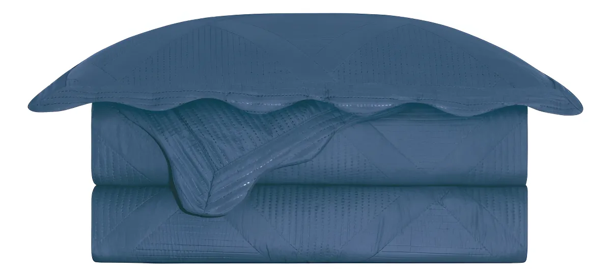 Confeccionada em tecido 100% poliéster de 70g/m² gramatura com enchimento robusto de 160g/m² de gramatura também em poliéster. A colcha Egeu é caracterizada pela sua textura com relevos em formas geométricas, finalizando com outra padronagem nas bordas e nas abas do porta-travesseiro.